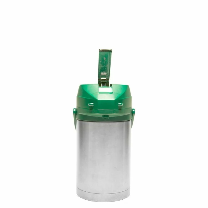 The Service Ideas CTAL25GRN Stainless Steel Lined Airpot with Lever, Green Top, 2.5 Liter can be used for both hot and cold beverages. Designed with a stainless steel insulation, it keeps beverages at the perfect serving temperature for 4 to 6 hours. Perfect for use in self-serve beverage stations, this server has a green plastic top for quick identification while its easy-to-use lever lid ensures convenient, mess-free dispensing.