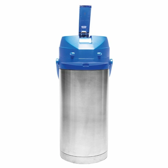 Use the Service Ideas CTAL37BLU Stainless Steel Lined Airpot with Lever, Blue Top, 3.7 Liter to store and serve hot beverages. An excellent addition to coffee shops and other food service facilities, this product retains heat and keeps the stored drink hot for up to six hours. Constructed from 18/8 stainless steel, this product is durable enough to stand up to the rigors of commercial use.