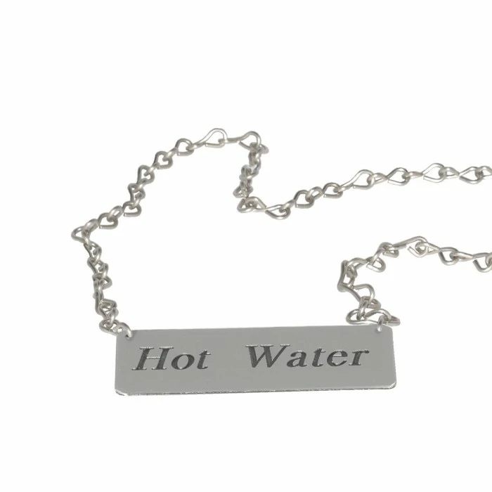 Easily label beverage servers and eliminate guesswork for your guests with the Service Ideas IDCHHW ID Chain “Hot Water” For Airpot Cover-Ups, Chrome. Designed with “Hot Water” in permanent laser cut lettering, this product is easy to read while its metal chain allows it to drape over airpot cover-ups for maximum visibility.